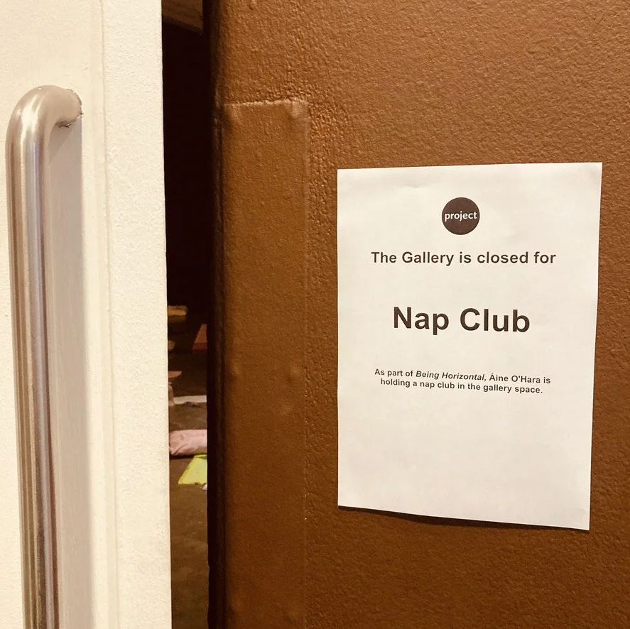 As part of Being Horizontal / Sínte, curated by Nora Heidorn at Project Arts Centre, Áine O’Hara hosted Nap Club, a small gathering inviting participants to rest together in the gallery space.
