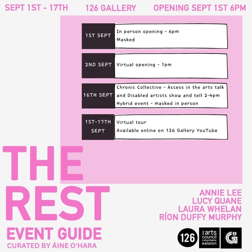 The Rest, held at 126 Artist-Run Gallery & Studios in Galway in September 2023, was an exhibition curated by Áine O’Hara focusing on the experiences of sick, disabled, d/Deaf, neurodiverse and mad artists. The exhibition explored how sick and disabled artists navigate an art world that is often not designed for them, while highlighting the urgent need for greater accessibility within cultural spaces.
